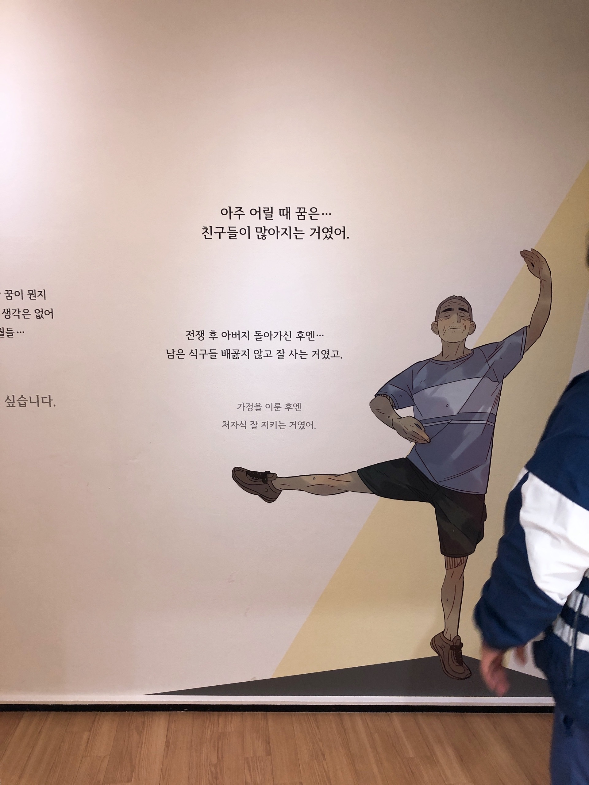웹툰 <나빌레라>의 두 주인공 ‘덕출’과 ‘채록’의 이야기를 좀 더 집중적으로 다룬 공간으로 두 사람이 어려움을 극복하고 갈등을 해결하는 가슴 뭉클해지는 글귀와 장면들이 전시되어있었다. 또 한 가지 보너스! 전시공간에 나빌레라 웹툰 장면과 글귀가 담긴 6종의 흑백 엽서가 비치돼 있어 기념 굿즈로 야무지게 챙겨 왔다.